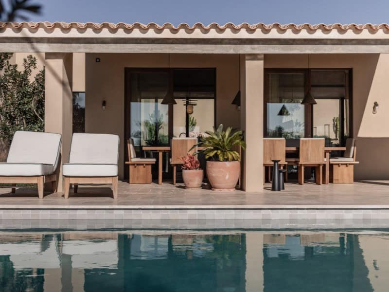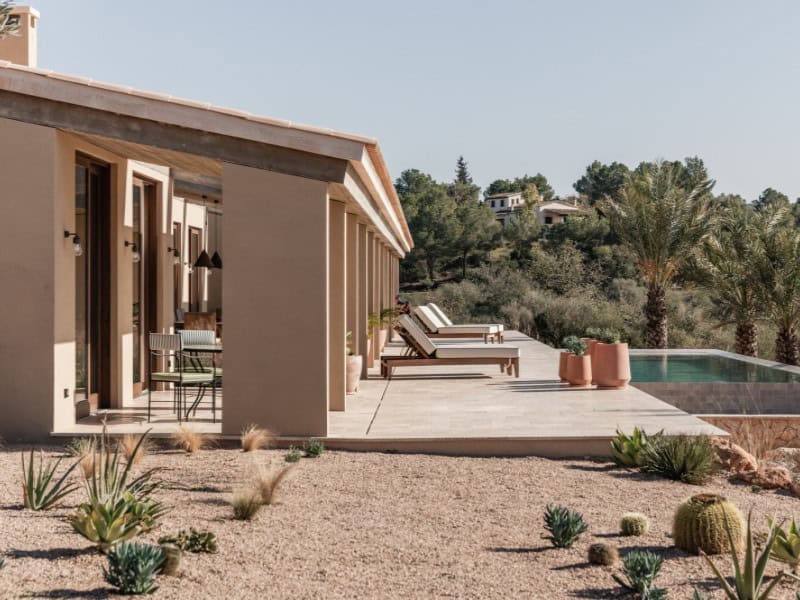 The finca’s exterior is truly spectacular. A sun terrace, a heated saltwater pool, an outdoor dining area, and a chill-out zone invite relaxation. The Mediterranean garden, with olive trees, palm trees, and a herb garden, provides an idyllic setting. A pétanque court, a fruit orchard, and a fire pit complete the ambience. The terrace also boasts stunning panoramic views of Palma Bay.