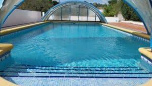 Outside we find a nice courtyard and a BBQ area, toilet and separate storage/utility room with washing machine and fridge freezer. There is a large 10×5 metre swimming pool which has a retractable dome shaped “heated cover”. It can be opened in full or in part and keeps the pool warm enough to swim in the Spring and autumn as well as the summer. Beyond the pool there is a good flat area which opens up many possibilities for its use and a storage building. In the garden there are palms, Mediterranean plants and a variety of fruit trees including a large apricot tree. The finca has about 40 grape vines of its own, and there are thousands more in view on the adjacent agricultural land owned by the neighbours.