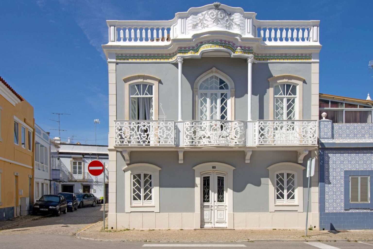 Symmetrically composed in three vertical sections, it features a central balcony supported by ornate corbels, artistic wrought-iron railings, and an impressive cartouche-style pediment with floral tile panels. The top is finished with balustrades and decorative azulejos.