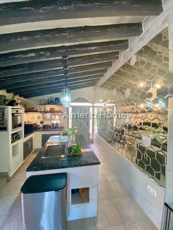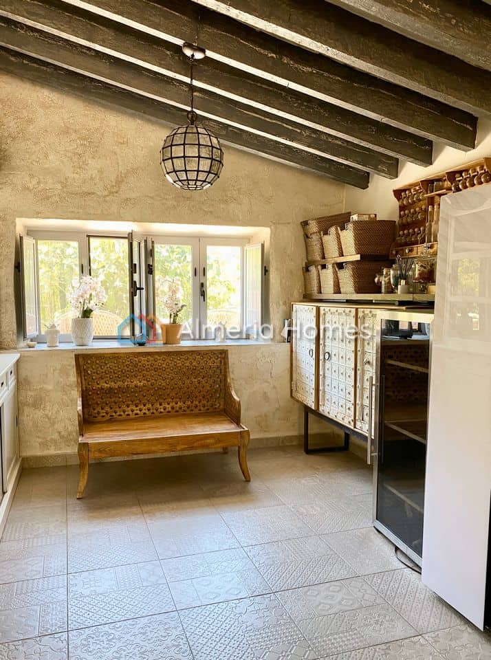 Two Characterful Countryside Homes with Pool, Gardens & Business Potential – Available Separately or Together. Situated on the edge of the Almanzora valley, just five minutes by car (or a 25–30 minute walk) from both Cantoria and Almanzora towns, and only ten minutes from the larger market town of Albox, this unique offering includes two fully renovated properties on adjacent plots. Each home has been thoughtfully restored to a high standard and retains its own distinct personality—making this a rare opportunity for multi-generational living, guest accommodation, or a boutique rental business. Propiedad 1 – Cortijo Árabe (AH14306) – This beautifully renovated 3-bedroom, 2-bathroom home combines traditional Moorish features with modern comfort. Set on a fully landscaped plot partially enclosed by decorative walled gardens, the property is just steps from the Via Verde—a scenic walking and cycling route repurposed from the region’s former railway lines. A private driveway leads to double wooden doors and into lush gardens with tropical planting, including banana, papaya, lemon, orange, and nispero trees. The pool area offers excellent privacy and mountain views, with multiple shaded patios for outdoor dining and relaxation. A detached casita with its own terrace makes an ideal guest suite or fourth bedroom, and there’s also a separate storeroom/workshop. Adentro, the heart of the home is a bright and spacious kitchen-diner with a central island and marble worktops throughout. Floor-to-ceiling mirrors add light and depth, and French doors open to a netted aviary—ideal to convert into a dining area. A sunroom (currently used as an office/dining room) connects to the garden, while the separate lounge offers a cosy space with a log burner. The ground floor also includes a large master bedroom with a walk-in wardrobe, a guest WC, and a stylish bathroom with roll-top bath and walk-in shower. Upstairs are two more double bedrooms and a second bathroom with brass fittings. Comfort is ensured year-round with ceiling fans, wall-mounted electric heaters, pellet and log burners, and double-glazed windows throughout. The property is connected to mains water, electricity, Internet, and features a water softener and gas water boiler. A small plot of land to the front is also included in the sale. Propiedad 2 – Cortijo África (AH14307) – Next door, this individual 2-bedroom, 2-bathroom home has been renovated with inspiration drawn from African design, creating a warm and welcoming space filled with character. A tiled double parking space leads to the main entrance, opening into a bright, open-plan kitchen-diner with French doors leading to one of three large terraces. A hallway leads to a spacious wet room, trastero, and a generous ground-floor bedroom. Through a rustic arch is a vaulted office/sitting room, followed by the main lounge with built-in log burner and picture window looking out to one of the garden areas. An antique door leads upstairs to a large, light-filled bedroom with en-suite shower room and separate gym area. French doors open directly onto the second terrace, and steps lead up to a third roof terrace with spectacular views across the Almanzora valley. The home benefits from high ceilings, double-glazed aluminium windows with shutters, wall-mounted electric heaters, and mains services including internet. The three terraces are consistently styled with quality tiling and are perfect for outdoor dining, relajante, or yoga with a view. Some furniture is negotiable. These two distinctive homes are full of charm, set in a quiet location with stunning surroundings, yet close to local amenities. Whether you’re looking for a home with separate guest space, a lifestyle change, o una oportunidad de inversión, this combination of properties is not to be missed.