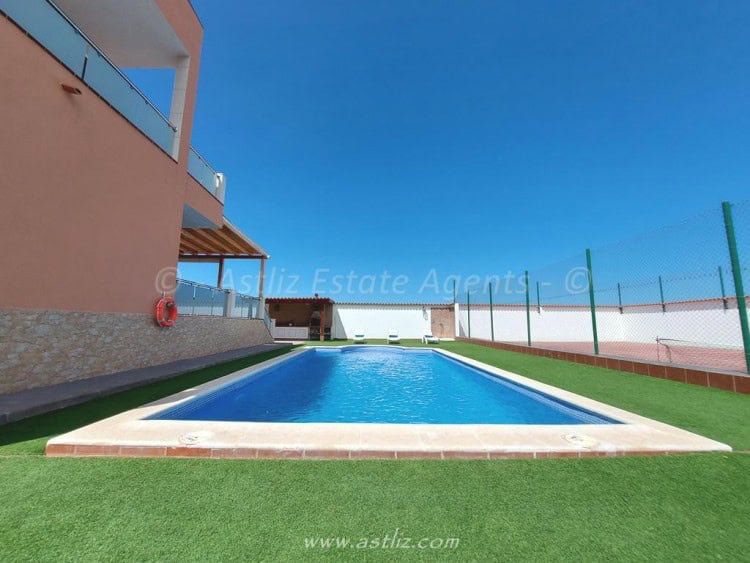 We are pleased to offer for sale this stunning luxury villa located in the residential area of Playa Paraiso in Costa Adeje . It is built over three stories with over 220 square meters of inside space and sits in a large 1,200 square meter plot of land. It has lots of outside space including gardens, a large private swimming pool, BBQ area and it’s own private tennis court. There is a massive underground garage which would easily fit about 6 à 8 voitures. There is also a lift to all floors.