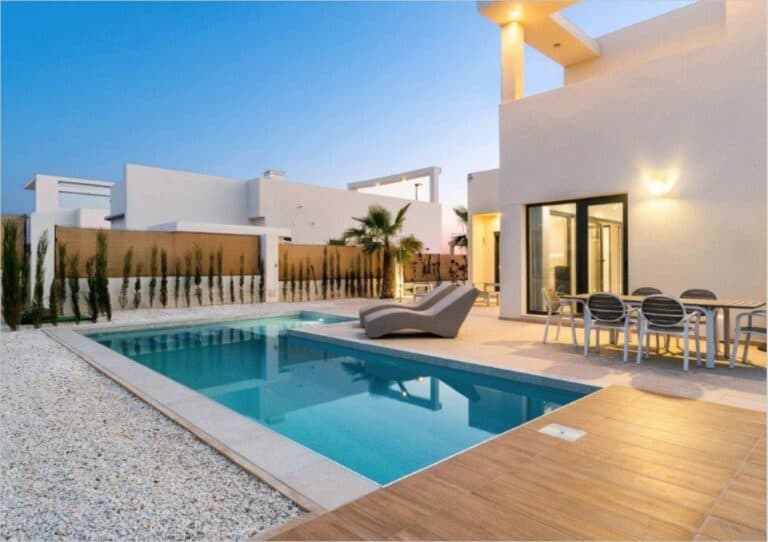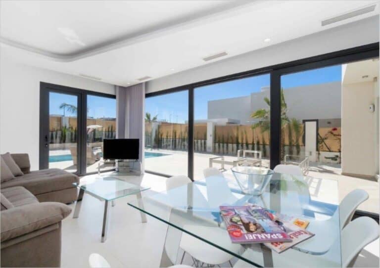 New build villa in Benijófar, Alicante. The property is all in one level and consists of 3 slaapkamers, 2 badkamers, living room, kitchen, terrace 12m 2 and solarium of 70 M2. Located on a plot of 450m2, it consists of garden with private pool and garage.