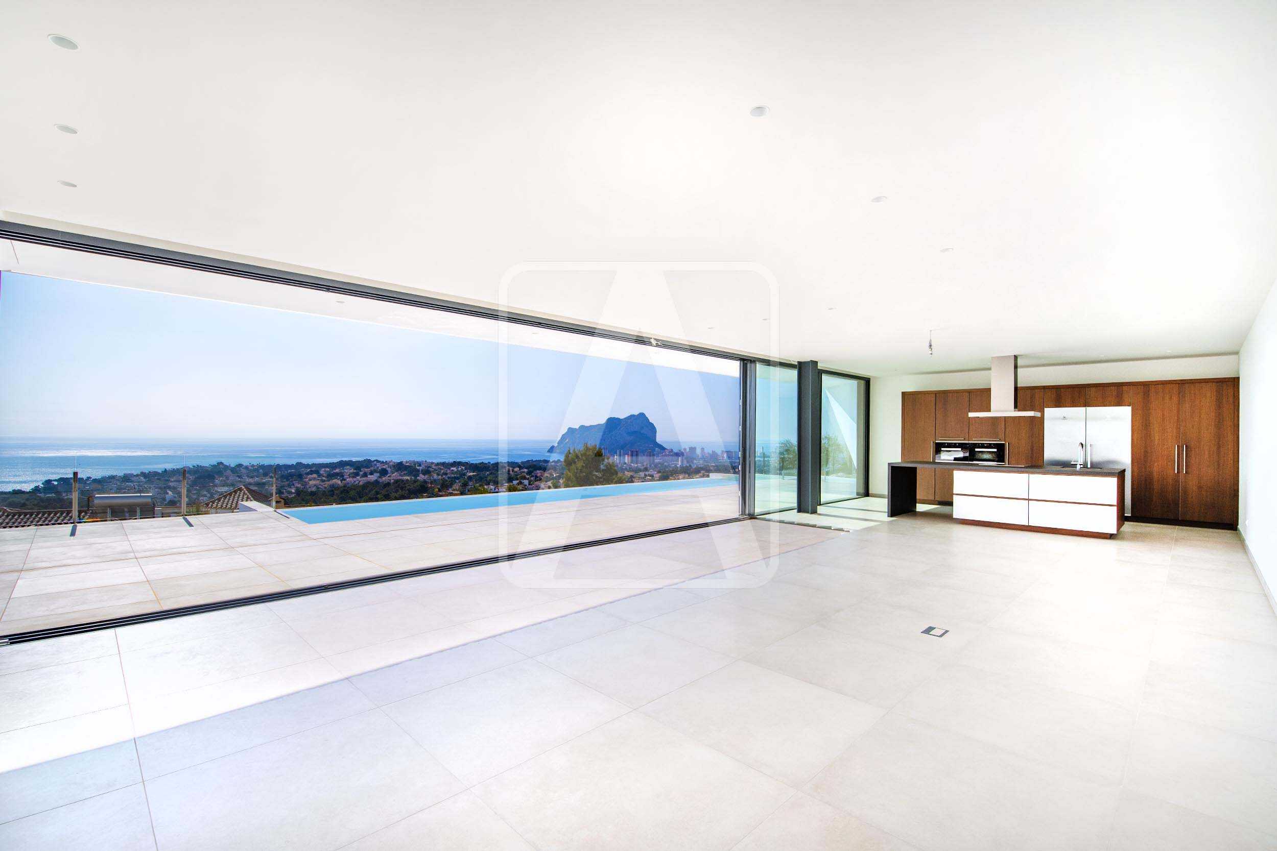 Newly built villa for sale in Benissa Costa, between Moraira and Calpe. This luxury villa with modern design is situated in an exclusive location and enjoys stunning views of the sea and the bay of Calpe. It is located 3 Km from the sea, op een plot van 1.700 m2 and has a total built area of 580 m2 distributed in 2 vloeren + basement, (with elevator), as follows: on the main floor we have entrance hall, large open plan kitchen living room of 75 M2, porch of 40 M2, 1 bedroom of 25 m2 with bathroom en suite and 1 guest toilet. On the upper floor we have 3 bedrooms with bathroom en suite, porch of 15 m2 and private terrace of 15 M2. In the basement we have the garage of 45 m2 for 2 vehicles and a space of 110 m2 to create a unique design to suit the client. It enjoys an outdoor terrace of 130 m2 where we have a beautiful pool of 50 m2 with infinity effect. It also has large outdoor areas to park a multitude of vehicles.