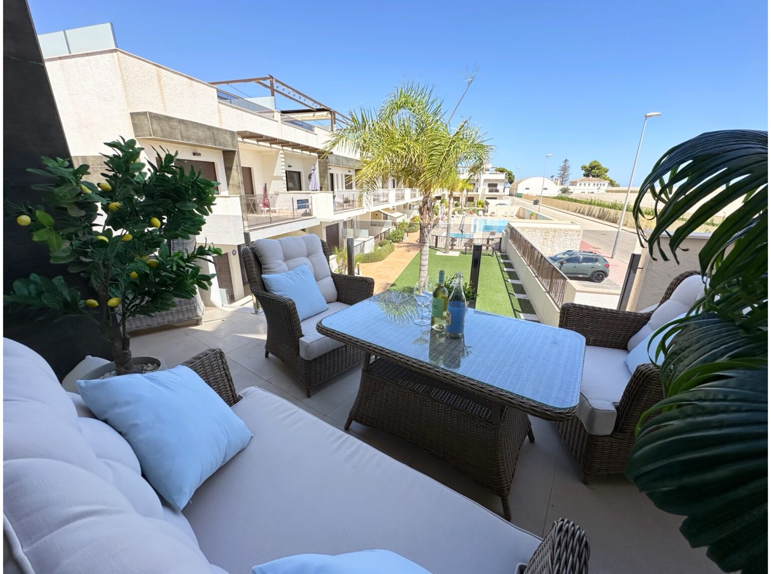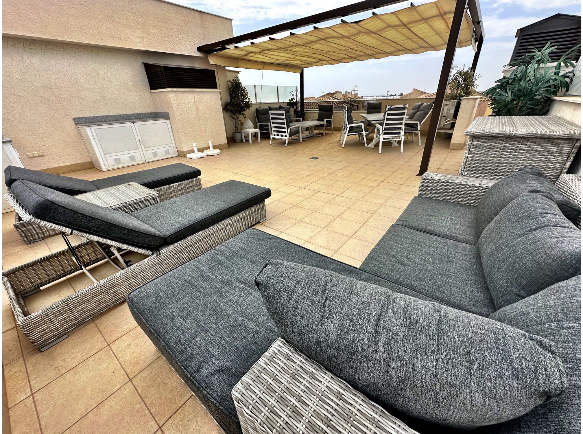 We are delighted to offer for sale this fabulous two bedroom two bathroom apartment with huge solarium for sale in Dolores de Pacheco.  Dolores is a wonderful town with several bars, restaurants and supermarket.  It is a 5 minute walk to the village of Roda and a 5 minute drive to the beaches of the Mar Menor in Los Alcazares.  The owners have put in a lot of love decorating this property, the furniture is included and is of extremely high quality.  Vented aircon is throughout the property, fly screens on doors and awnings on the terrace of the lounge master bedroom and on the roof solarium.  The apartment is on the first floor and has a larger than average roof solarium.  You also have access to a shared private pool.