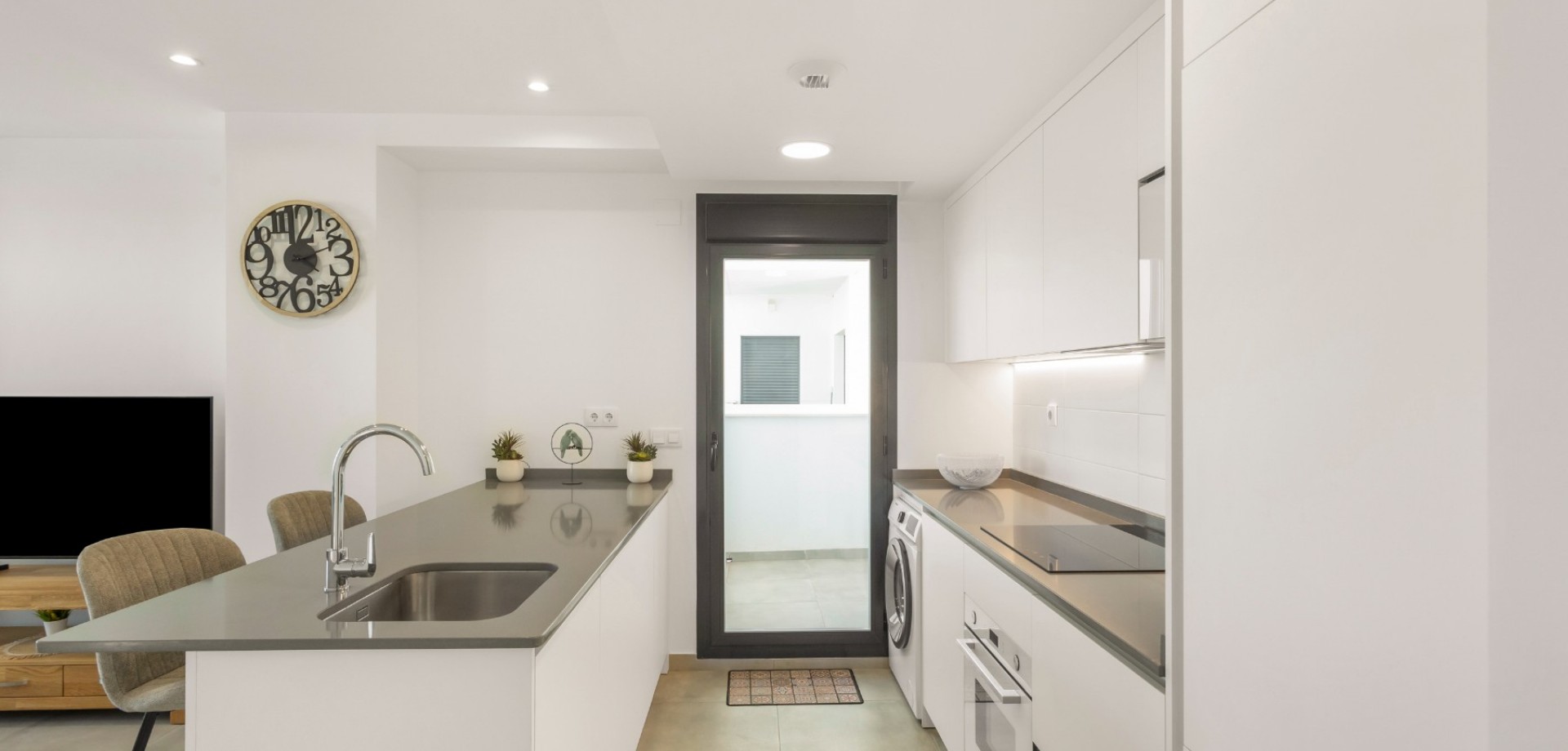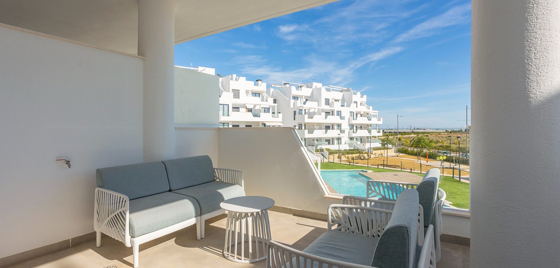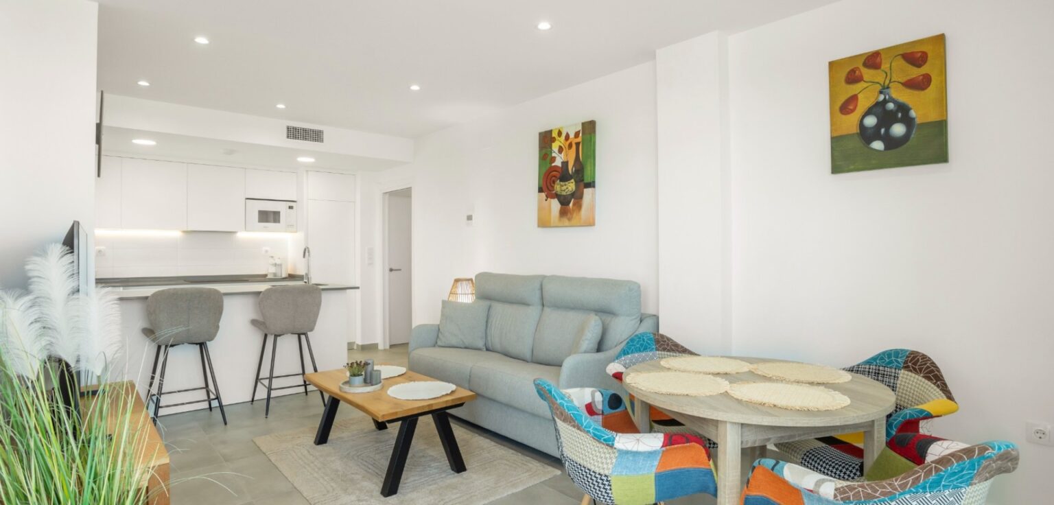 On Entering the property off the hallway you will find two double bedrooms with fitted wardrobes and a family bathroom with a window. The master bedroom has its own ensuite also with a window and its own private terrace. The open plan kitchen diner living room has patio doors to the terrace that has views over the communal pools. Residents have access to two communal swimming pools — one of them heated — as well as an outdoor gym, jacuzzi and children’s play area, providing everything you need to enjoy life all year round. The property comes furnished, vented AC, underground parking and a storeroom.