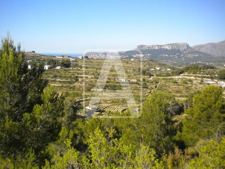 A sloping plot of 14.574 m2 with panoramic mountain views to the Sierra de Bernia and some sea views to the sea, facing South. Possible build surface of 750 m2 on three floors. Very good access to the whole plot. Electricity and water connections and also own well. For lovers of space and rural tranquility, near the coast between Benissa, Calpe and Moraira.