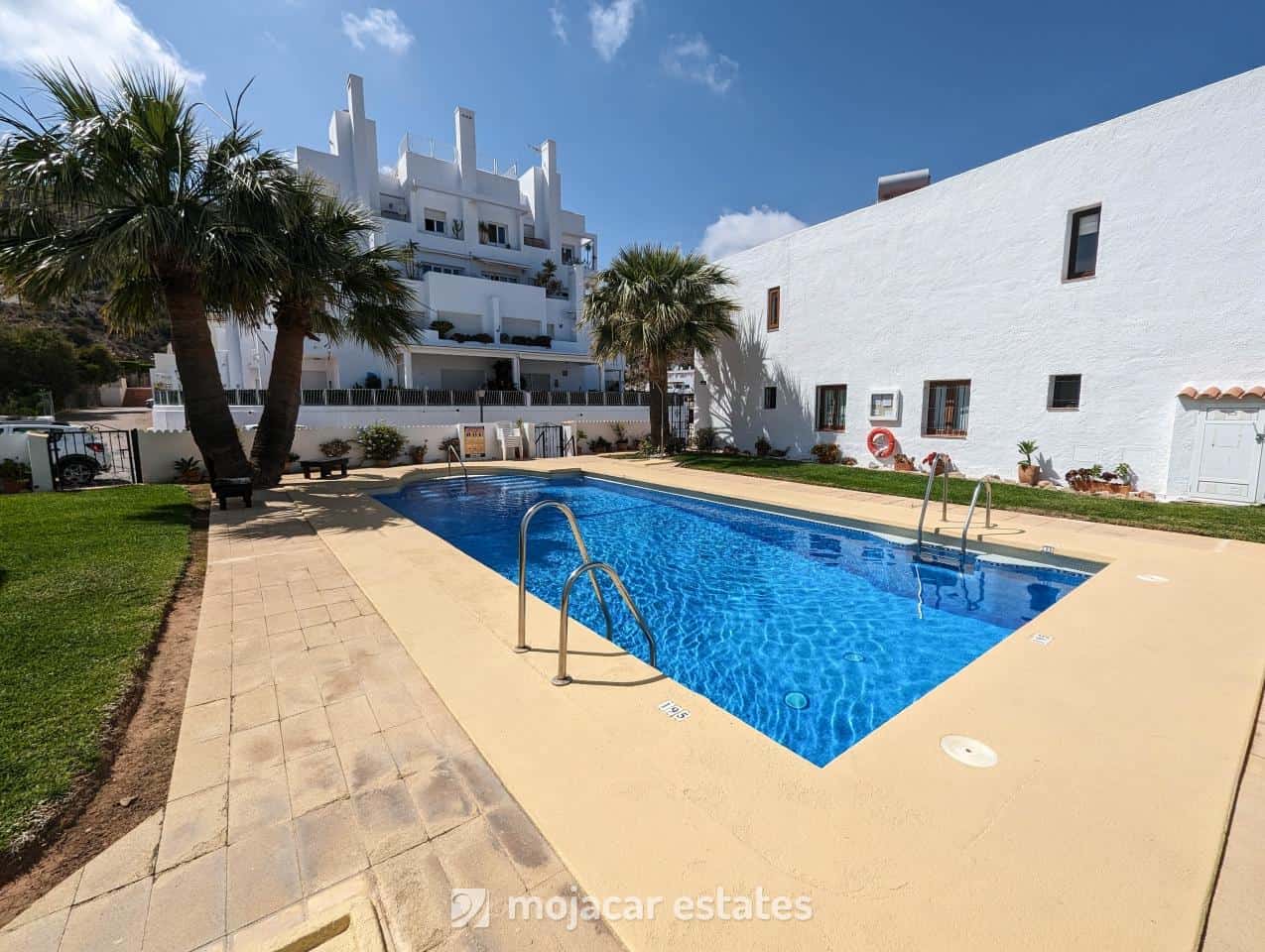 This townhouse is in a residential complex called Balcones del Mar in Calle Jesus de Perceval. There is a free community parking outside. A community gate will lead you inside to the pool and garden area. You will find the house on the other side of the pool and its directly facing the sea.