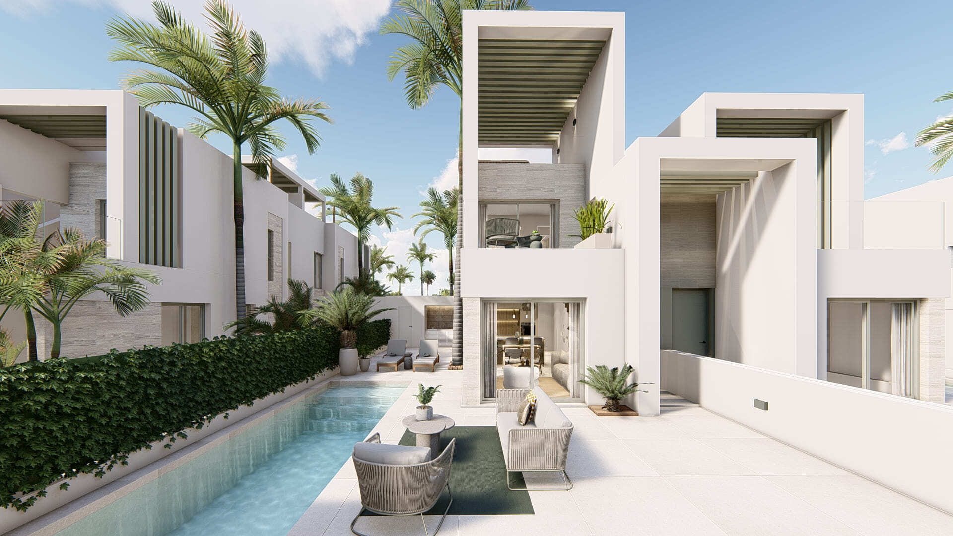 Discover this exclusive development of 30 semi-detached properties in Ciudad Quesada, one of the most sought-after areas of the Costa Blanca, ideal for sea and golf lovers. Each property, modern in style, offers 3 bedrooms, 2 bathrooms and a toilet distributed over 93 square metres. The properties stand out for their spacious terraces and plots ranging from 167 square metres, providing green spaces to enjoy the outdoors. In addition, each property has a private swimming pool and a magnificent 30 square metre solarium, with the option to add a Jacuzzi or a summer kitchen to maximise your comfort and lifestyle.OUTDOOR AREASThe homes combine modern design with high quality materials, such as white concrete and stone, creating a sophisticated and contemporary aesthetic. The exteriors are designed for maximum enjoyment of the Mediterranean climate, with spacious terraces that allow natural light to flood in throughout the day. The green areas perfectly complement the design, providing a fresh and relaxing atmosphere. In addition, each property has a private swimming pool, ideal for cooling off on hot summer days, and offers the option of adding a Jacuzzi on the solarium for unique moments of outdoor relaxation.INDOOR AREASThe interiors of these homes are designed with comfort and functionality in mind, with high quality finishes and a modern style. The 93 square metre space is efficiently distributed in 3 bright bedrooms, 2 full bathrooms with luxury finishes and an additional toilet. The living areas are spacious and open, facilitating integration between the living room, dining room and kitchen, which creates a perfect environment for entertaining and family gathering. Large windows let in abundant natural light, enhancing the feeling of spaciousness and connection to the outside environment.