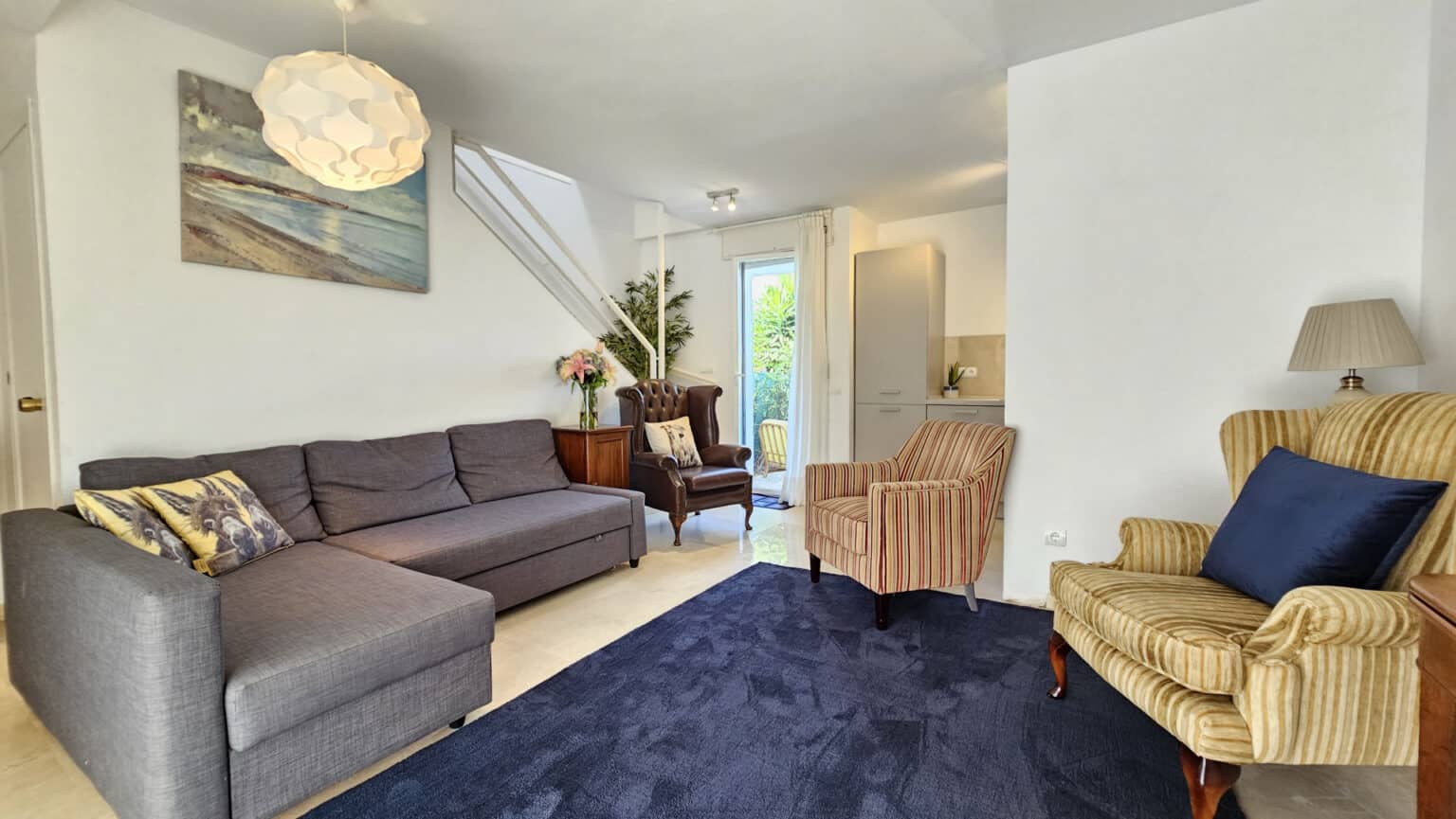 The property features a fully fitted kitchen, and a private back garden/patio, providing a serene outdoor space for relaxation. Although there is no private pool, the town house is at close proximity to the river, sea and beach, allowing for easy access to the stunning coastline and an array of available watersports. Additionally, the property is situated near various amenities, including beach clubs, small shops, and medical facilities, ensuring all essential needs are met.