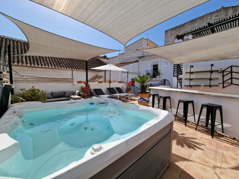 Exclusive to villasolutions: Casa La Terraza unique centrally located town house in the historical part of Vinuela village. Each floor has been upgraded, so this 200m2 property now, split over two self contained apartments, consists of: 5 bedrooms, 3 bathrooms, two fully equipped kitchens, three lounges, 3 large south facing terraces with views, two pergolas for shade and a sail shaded jacuzzi with solar installion for electric. Many features both inside and out including outdoor bar, internal feature well, and bodega plus extra storage room, . An urban property, connected to all mains services plus there is public parking outside, beautiful village gardens, a paddle court , the riverbed, a restaurant and butchers all just two minute walk away. Sold part furnished, a one off property which can easily be one 5 bedroom home.