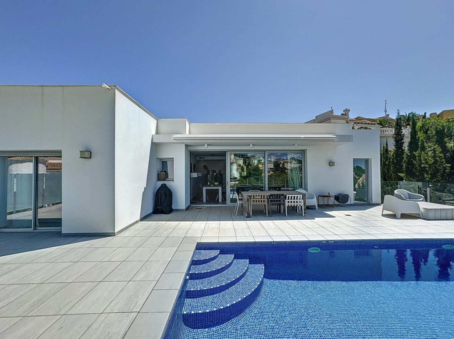 Contemporary Luxury Villa with Sea Views in Cumbre del Sol Discover this stunning newly built villa, designed in an elegant contemporary style and located in the exclusive residential area of Magnolias, within the prestigious Cumbre del Sol residential development, between Jávea and Moraira, in the charming municipality of Benitachell. With a total built area of 319 m², this spectacular property offers 194 m² of living space, 86 m² of terraces, 4 m² of covered terrace, a 9 m² machine room and a convenient parking space of 26 m², all on a generous plot of 1,111 m². Distributed over two floors, the villa has 4 spacious bedrooms and 3 modern bathrooms. The bright main living-dining room, with an open-plan designer kitchen, opens directly onto the terrace and private swimming pool, creating the perfect space to enjoy the Mediterranean climate. In addition, there is a second living-dining room with direct access to the garden, multiple terraces, and a machine room. The villa is in impeccable condition, practically brand new, and is surrounded by a beautiful Mediterranean garden, ideal for relaxing and enjoying different outdoor environments. Furthermore, the property is equipped with underfloor heating and ducted air conditioning, guaranteeing maximum comfort all year round. Discover the luxury and exclusivity of Magnolias Residential Estate in Cumbre del Sol, Benitachell In the coveted Cumbre del Sol residential development, in the heart of the Costa Blanca, you will find Residencial Magnolias, a prestigious area of villas designed to offer a unique lifestyle, where luxury and comfort blend with the beauty of the natural surroundings. Residencial Magnolias has 196 plots of between 750 and 1,200 m², carefully designed to blend in harmoniously with the Mediterranean landscape and make the most of the stunning sea views. Each plot is strategically orientated to the east, south or west, guaranteeing exceptional natural light and spectacular views of the Mediterranean. Located in the southern area of Cumbre del Sol, Magnolias enjoys a privileged position, bordering the exclusive residential areas of Kalmias, Lirios and Palmeras. In addition, its proximity to the southern entrance of the development ensures easy access and an unbeatable location within this distinguished community. Nearby amenities for a full and active life The location of Magnolias not only stands out for its tranquillity and incomparable views, but also for its proximity to essential services and leisure facilities that make this area an ideal place to live: 1 or 2 kilometres away :Dreamsea Mediterranean Camp, with a relaxed atmosphere, bar, restaurant and direct access to the lovely Morach beach and the picturesque coves of Los Tiestos and Llebeig.3 to 4 kilometres away:Adelfas shopping centre , which includes:Pepe la Sal supermarket .Hairdresser and maintenance and rental agency.Restaurants such as the cafeteria bar and the well-known La Cumbre.Chemist.Sports facilities for paddle tennis and tennis, a sports centre with bar and the prestigious international Lady Elizabeth School.Mercadona supermarket, with fresh, quality products.6 to 8 kilometres away:Mas y Mas supermarket.Benitachell town centre.The charming beach of El Portet de Moraira.The exclusive golf course of Jávea.13 kilometres away:The famous Arenal beach in Jávea, with its vibrant promenade, first class restaurants and varied leisure offer.A place to enjoy life to the full Living in Residencial Magnolias means waking up every day surrounded by the serenity and beauty of the Mediterranean, without giving up the comfort of having everything you need at your fingertips. From relaxing walks on the beach to access to exclusive services, this is a unique opportunity for those looking for a residence that combines luxury, nature and comfort. Are you ready to take the step towards an exceptional life? We invite you to get to know Residencial Magnolias and discover why this community is the ideal place for your new home on the Costa Blanca. Contact us today and let us help you find the villa of your dreams. At Cumbre del Sol Pre-Owned, we are committed to making your wishes come true.