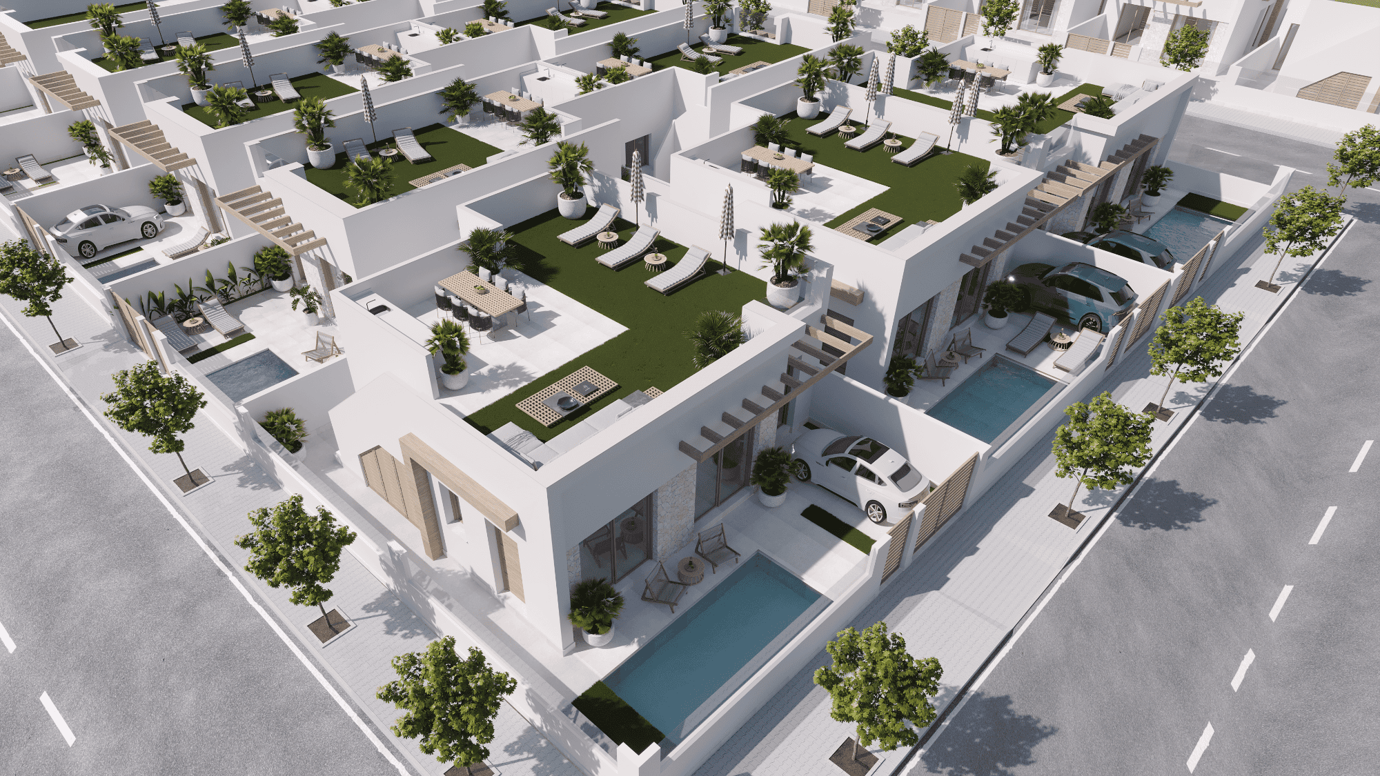 In the charming Roldán (Murcia) 11 detached villas will be built, of which currently only the models with 2 bedrooms and 2 bathrooms are still available. All villas have a private plot of 140.45 m² to 141.74 m², a built area of 74.72 m² and a private swimming pool of 11.25 m² with outdoor shower. On the spacious solarium (66.81 m²) there is also an outdoor kitchen and a water connection.
