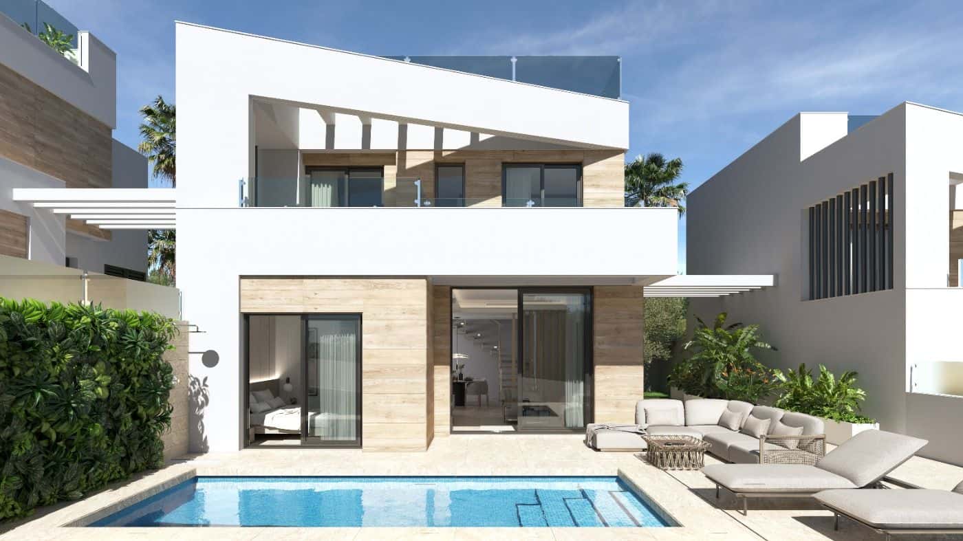 Amazing signature villas with high qualities and design. Only 1 villa left!!~~The villas have a open style kitchen and living room and there is one bedroom downstairs with access to the pool area. ~~The living area has large sliding doors that access the outdoor area where you have a 2.5x6m swimming pool. The open stairs in the living room take you to the first floor where you will find the master bedroom with en-suite bathroom and the third bedroom. Both have access to the terrace.~~Bathrooms have heated floors and all villas have a solarium.~~Located in the middle of the 3 best Golf coursed of the Costa Blanca South and surrounded by restaurants, supermarkets and public transportation.~~The beaches of Campoamor are only a 7km drive from the villa. ~~Completion date is 12/14 months from signing purchase contract