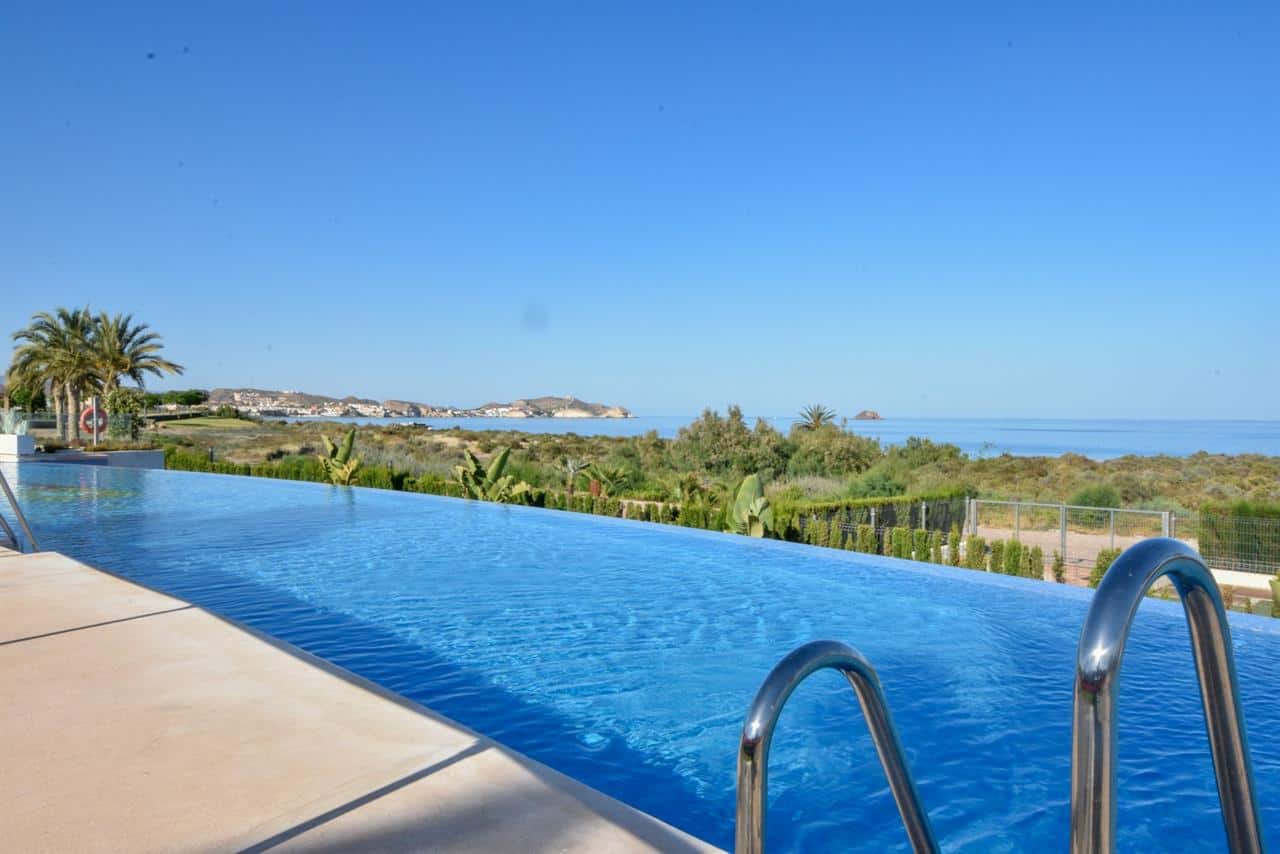 Luxury 3 bedroom ground floor property in the front line development, phase 6 of Mar de Pulpi residence in San Juan de Los Terreros. Right in front of the swimming pool, 3 sovrum 2 bathroom ground floor home, with great views, spacious terraces, and a wonderful private garden, plenty of space for lounging around and enjoying the fabulous views of the sea and the area. The property has a fully fitted modern kitchen with a utility room leading off. Large lounge dining room, leading out onto the spacious terrace and large garden beyond.