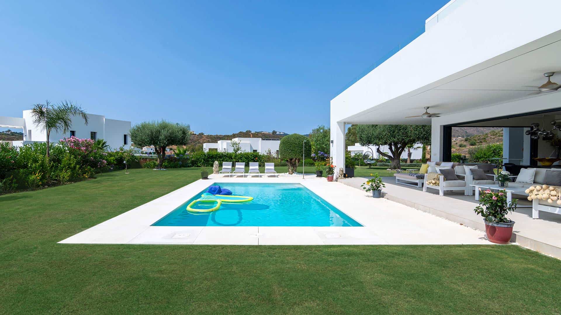 The gardens have been beautifully nurtured with additional plants and shrubs around the perimeter, which truly enhance the green lawns surrounding the pool. A lovely olive tree takes pride of place in the garden, having been preserved from the original la Cala de Mijas landscape.