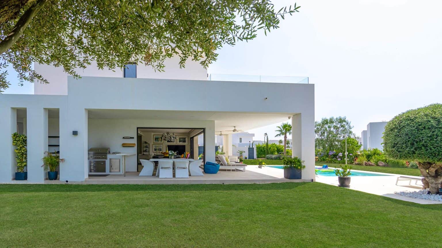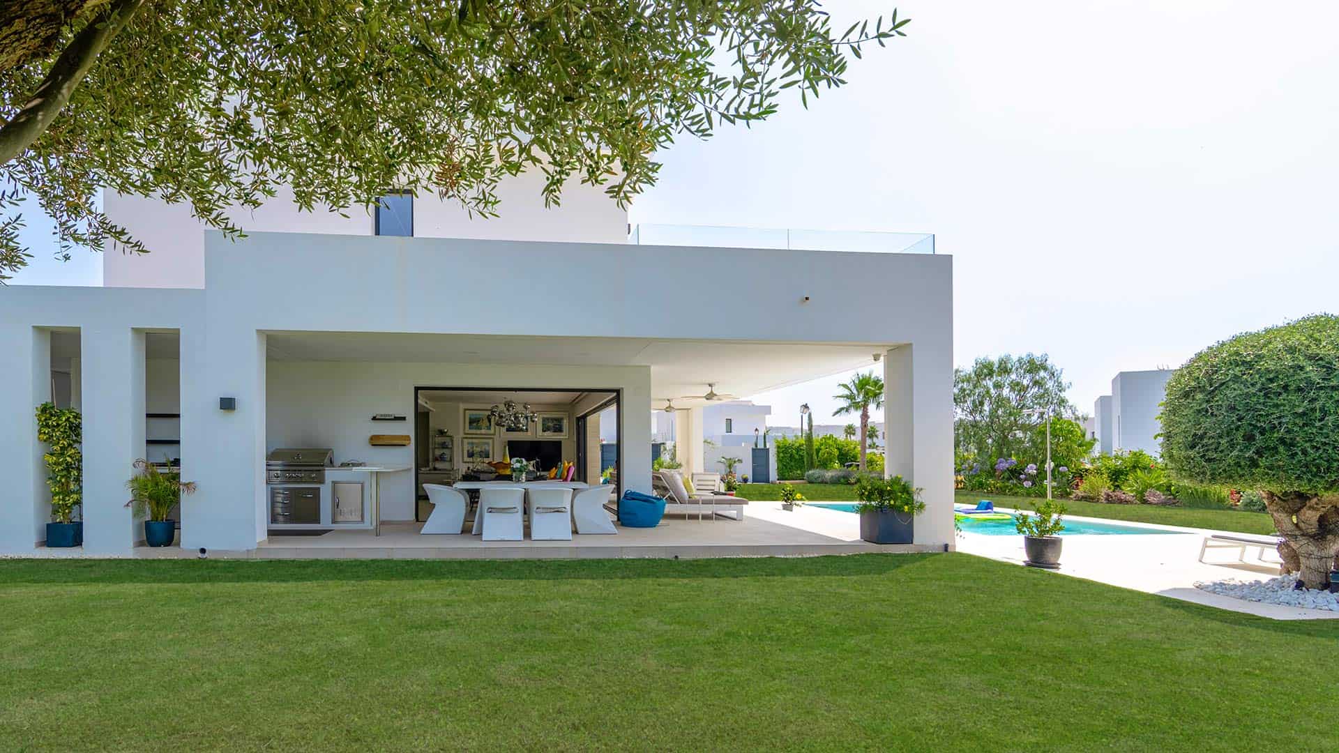 There is a pathway from the garage and parking spaces that leads behind the villa to the impressive front door. Opening into the open-plan living and dining area, there is an abundance of light thanks to the floor-to-ceiling patio doors which span both adjacent walls of this great living area. The views to the verdant green lawns of the garden and the glistening waters of the pool are simply gorgeous, and the possibility to open all of the patio doors to allow interior and exterior space ensures that the very best al fresco lifestyle can be enjoyed.